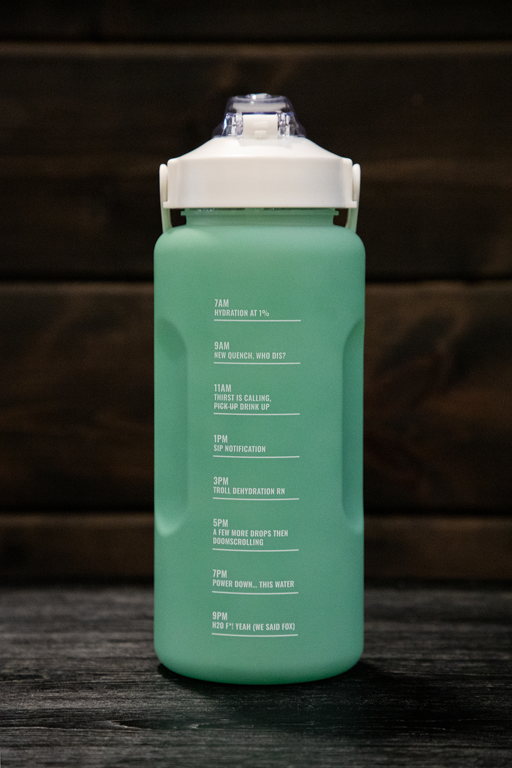 Lock in with 64 oz of motivation. This bottle is fitted with sipping reminders to keep you from slipping throughout the day. Made from 100% toxin-free BPA copolyester plastic. Handwash only with soapy water.
